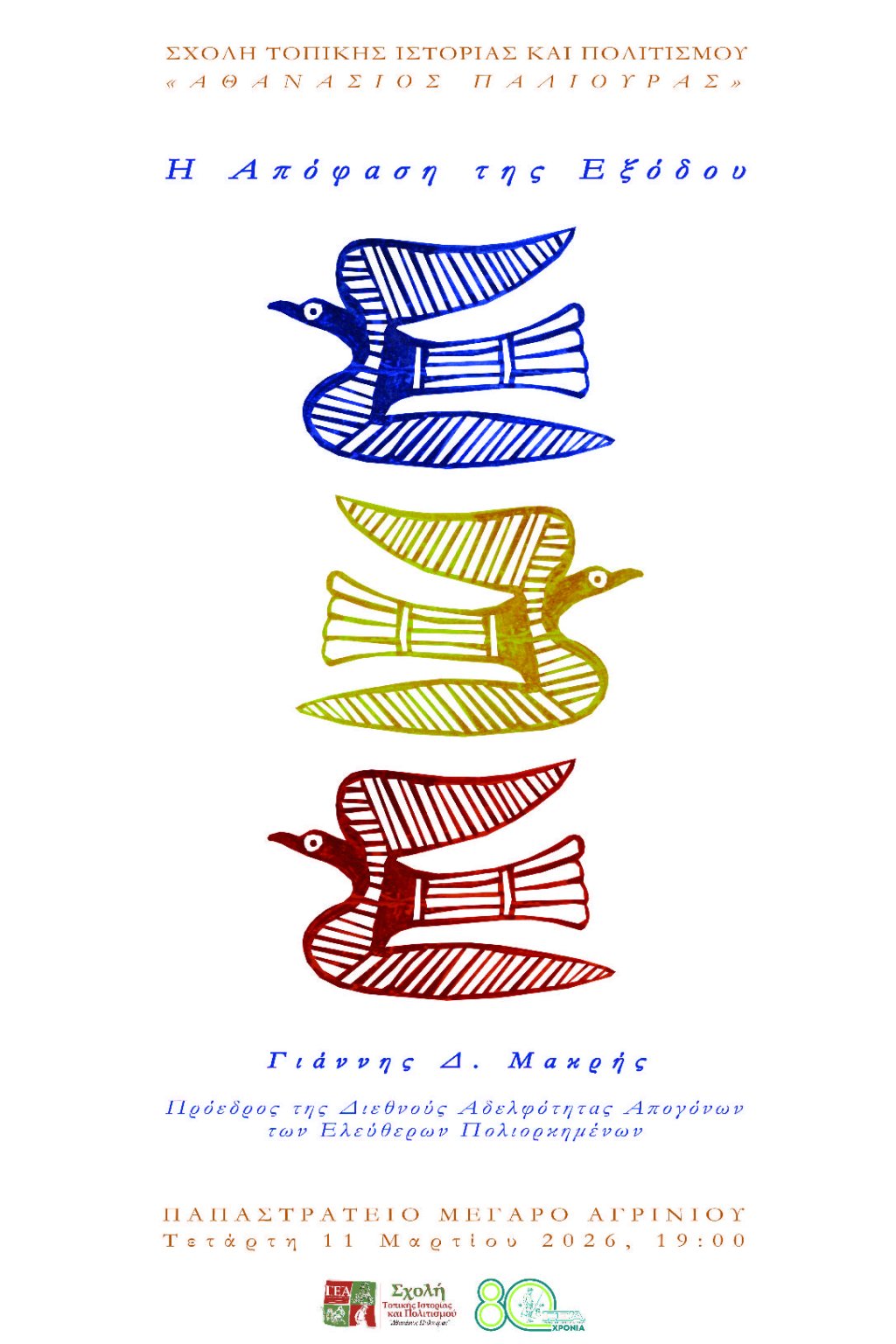 Η Σχολή Τοπικής Ιστορίας και Πολιτισμού “Αθανάσιος Παλιούρας“, της Γυμναστικής Εταιρείας Αγρινίου, παρουσιάζει την Τετάρτη 11 Μαρτίου 2026 και ώρα 19:00 στο Παπαστράτειο Μέγαρο Αγρινίου τον πρόεδρο της Διεθνούς Αδελφότητας Απογόνων των Ελεύθερων Πολιορκημένων Γιάννη Δ. Μακρή. Θέμα της ομιλίας του: “Η Απόφαση της Εξόδου”