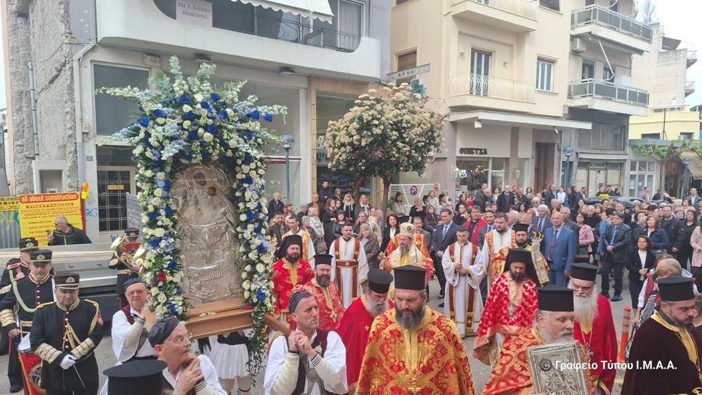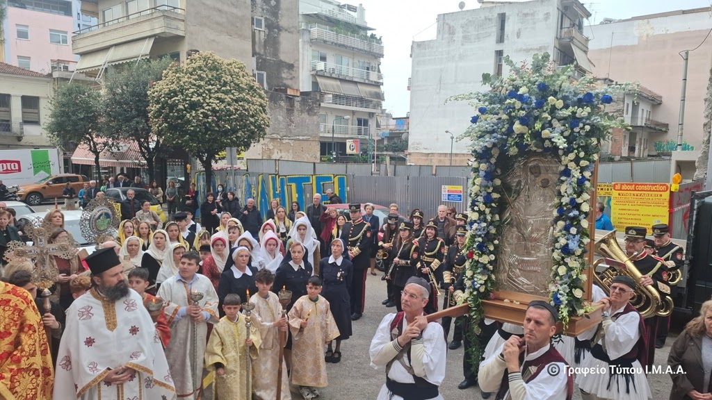 Κατά την επιστροφή στον Ιερό Ναό ο Σεβασμιώτατος Ποιμενάρχης μας ευχαρίστησε τους Ιερείς και τα στελέχη της Ενορίας για την προετοιμασία της ιεράς πανηγύρεως, ευχόμενος η Υπεραγία Θεοτόκος να προστατεύει και να σκέπει ολόκληρη την πόλη.