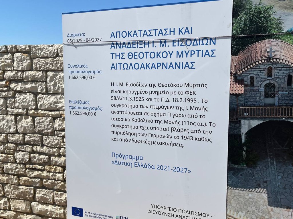 Σε πανηγυρική ατμόσφαιρα πραγματοποιήθηκε την Δευτέρα 15 Σεπτεμβρίου 2025 ο Αγιασμός για την έναρξη των εργασιών Αποκατάστασης και Ανάδειξης της ιστορικής και βυζαντινής Ιεράς Μονής Εισοδίων της Θεοτόκου Μυρτιάς Τριχωνίδος.