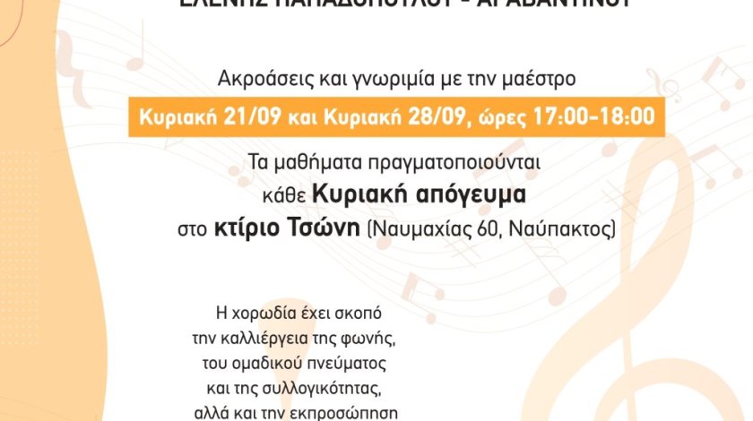 Σημειώνεται ότι, τα μαθήματα της Παιδικής-Νεανικής Χορωδίας θα πραγματοποιούνται κάθε Κυριακή απόγευμα στο κτήριο Τσώνη (ισόγειο, έναντι πλαζ Ναυπάκτου – παραλία Ψανής), ενώ οι ακροάσεις και η γνωριμία με τη μαέστρο θα λάβουν χώρα την Κυριακή 21.9.2025 και την Κυριακή 28.9.2025, ώρες 17:00’ – 18:00’ στον ίδιο χώρο.