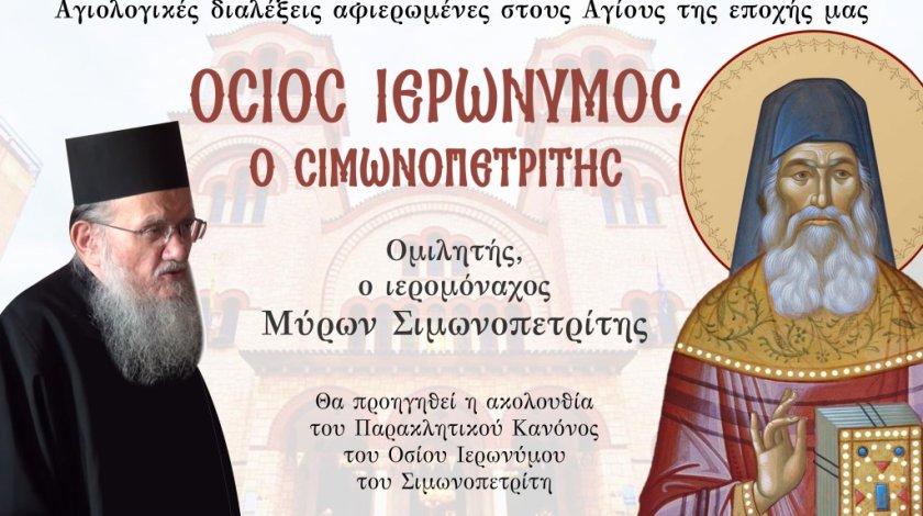 Ομιλητής θα είναι ο Οσιολογιώτατος Ιερομόναχος Μύρων Σιμωνοπετρίτης, Αδελφός της Ιεράς Μονής Σίμωνος Πέτρας Αγίου Όρους.