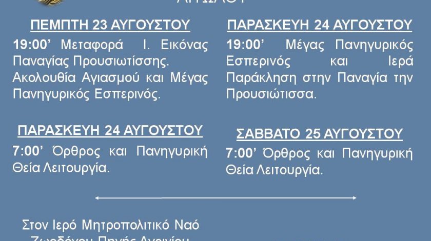 την Σύναξη της Ιεράς Εικόνος της Παναγίας της Προυσιωτίσσης, αντίγραφο της οποίας θησαυρίζεται στον Ιερό Μητροπολιτικό Ναό Ζωοδόχου Πηγής Αγρινίου, σε ανάμνηση της διάσωσης του Αγρινίου από την επιδημία της χολέρας το έτος 1854.