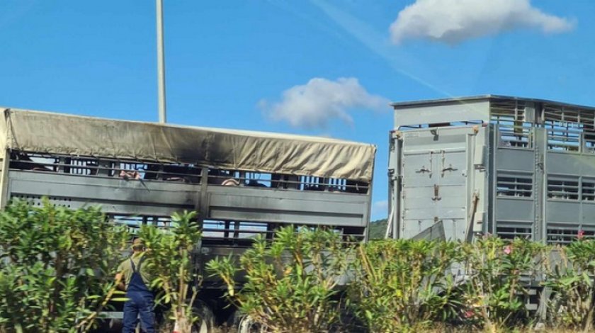 Το φορτηγό με την ρυμουλκούμενη καρότσα που επίσης μεταφέρει ζώα, κινούνται στην Ιόνια Οδό με κατεύθυνση προς Αντίρριο, όταν στο ύψος της Knauf στην Αμφιλοχία άρχισαν να βγαίνουν καπνοί.