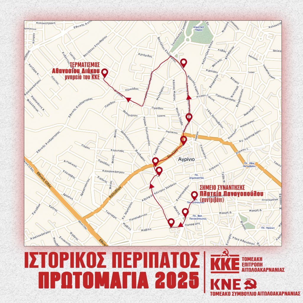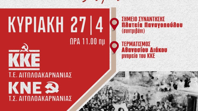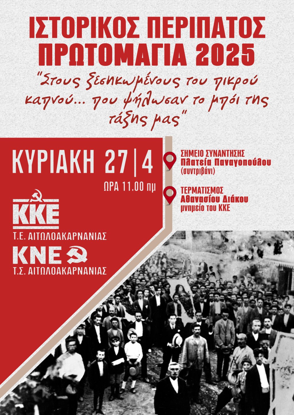 Η Τομεακή Επιτροπή Αιτωλοακαρνανίας του ΚΚΕ και το Τομεακό Συμβούλιο Αιτωλοακαρνανίας της ΚΝΕ, διοργανώνουν ιστορικό περίπατο στο Αγρίνιο, την Κυριακή 27 Απριλίου, στις 11πμ, μπροστά στην Πρωτομαγιά, με τίτλο: «Στους ξεσηκωμένους του πικρού καπνού…που ψήλωσαν το μπόι της τάξης μας», αφιερωμένο στους αγώνες της εργατικής τάξης της πόλης μας, με πρωτοπόρους τους καπνεργάτες.