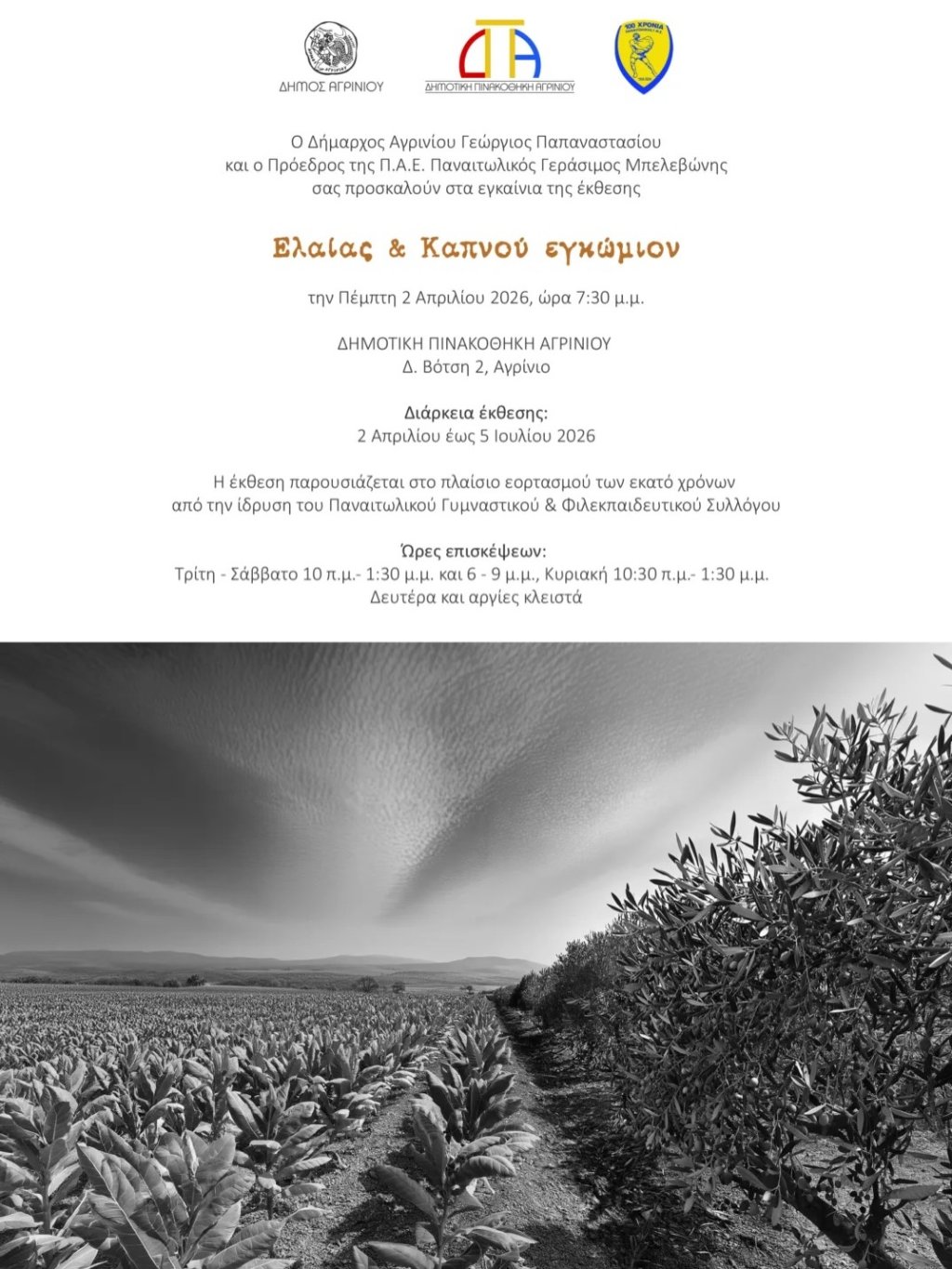 Το παλιό σύνθημα ΕΛΙΑ – ΚΑΠΝΟΣ – ΠΑΝΑΙΤΩΛΙΚΟΣ με το οποίο τονίζεται η σύνδεση του Συλλόγου με τον τόπο μας, αναδεικνύεται πολλές φορές τα τελευταία χρόνια μέσα από δράσεις που έχουμε πραγματοποιήσει. Στη φετινή επέτειο των 100 χρόνων ο Δήμος Αγρινίου και η Δημοτική Πινακοθήκη υιοθέτησε την πρότασή μας και ανέλαβε τη διοργάνωση έκθεσης, την οποία επιμελήθηκε ο καλλιτεχνικός Διευθυντής της κ. Χρήστος Γαρουφαλής. Έχει τίτλο Ελαίας και Καπνού εγκώμιον και περιλαμβάνει σημαντικά έργα διακεκριμένων εικαστικών αλλά και ντόπιων δημιουργών.