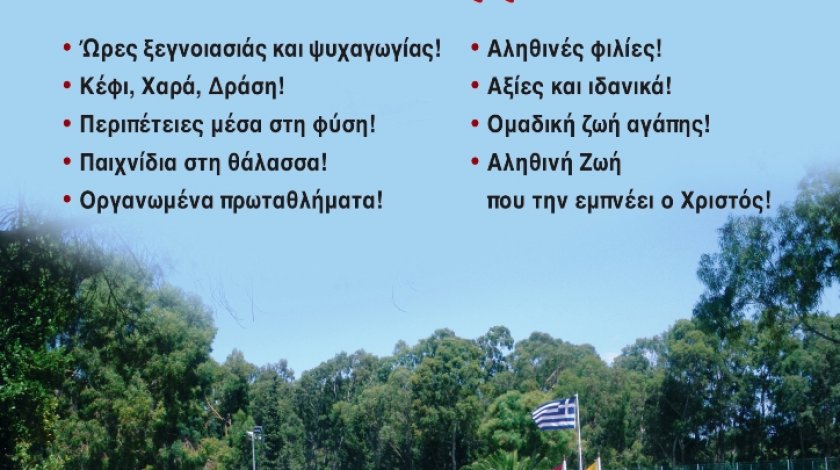 Από την Δευτέρα 13 Μαΐου 2024 ξεκινούν οι εγγραφές στις Κατασκηνώσεις της Ιεράς Μητροπόλεως Αιτωλίας και Ακαρνανίας. Οι εγγραφές θα πραγματοποιούνται καθημερινά: