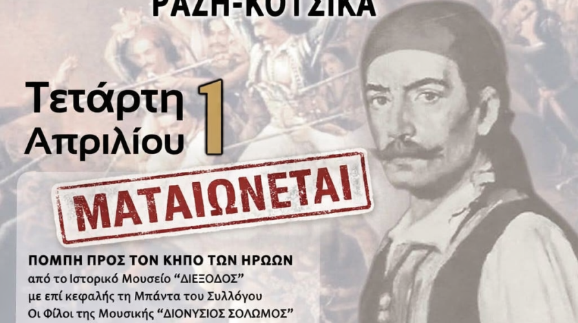 Ο Σύλλογος «Οι Φίλοι της Μουσικής Διονύσιος Σολωμός» και το Ιστορικό Μουσείο «Διέξοδος» ενημερώνουν το κοινό ότι η προγραμματισμένη εκδήλωση για την «Ημέρα του Αρχηγού», στο πλαίσιο των Εορτών Εξόδου, δεν θα πραγματοποιηθεί λόγω των προβλεπόμενων δυσμενών καιρικών συνθηκών.
