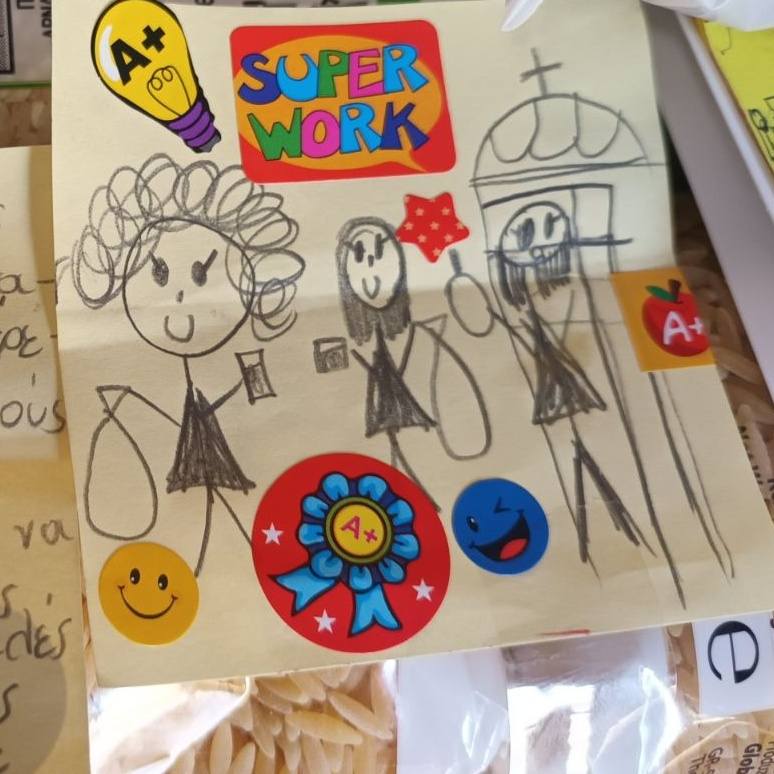 Η γιαγιά Μαρίνα έφερε την εγγονή της, τη μικρή Μαρίνα-Εμμανουέλα, μαθήτρια των πρώτων τάξεων του δημοτικού, για να της δείξει τον χώρο των συσσιτίων. Της μίλησε για την προσφορά και την αγάπη των εθελοντριών της Εκκλησίας προς τις φτωχές οικογένειες.