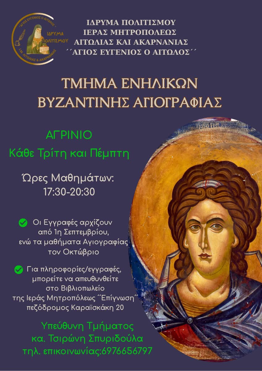 Η Τοπική μας Εκκλησία και το Ίδρυμα Πολιτισμού , σε συνεργασία με δύο εξαίρετους αγιογράφους , την κα Σπυριδούλα Τσιρώνη και τον κ. Αθανάσιο Γκέρκη Thanasis Gkerkis αρχίζουμε μαθήματα Αγιογραφίας για παιδιά και ενήλικες σε Αγρίνιο και Μεσολόγγι.