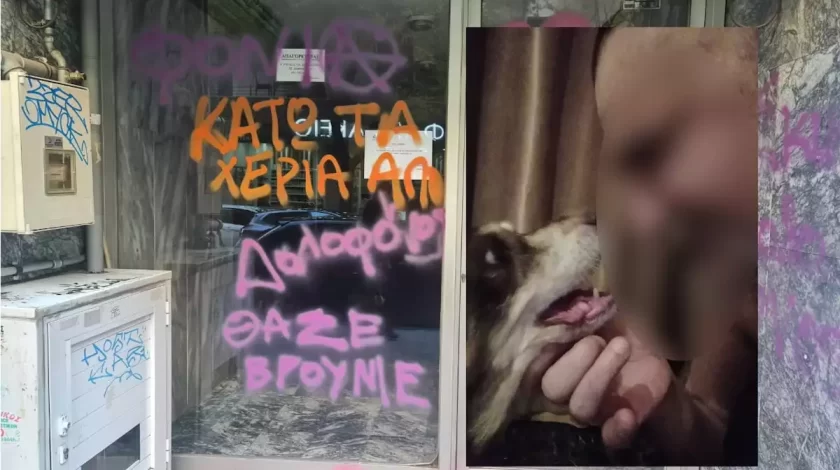 «Δολοφόνε» και «κάτω τα χέρια από τα ζώα» είναι τα συνθήματα που έχουν γραφτεί στην είσοδο της πολυκατοικίας στην Κυψέλη που μένει ο 47χρονος που θανάτωσε με τον φρικιαστικό τρόπο το 14χρονο σκυλί του, την Ήρα.