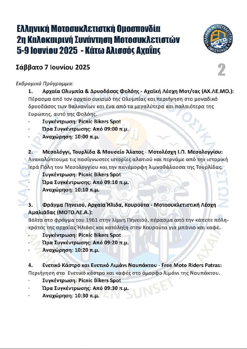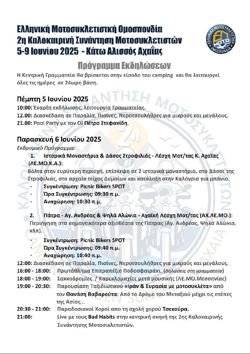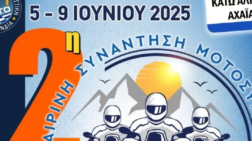 Η Ελληνική Μοτοσυκλετιστική Ομοσπονδία (ΕΛ.ΜΟΤ.Ο.) συνδιοργανώνει με την Περιφέρεια Δυτικής Ελλάδας και τον Δήμο Δύμης τη 2η Πανελλήνια Καλοκαιρινή Συνάντηση Μοτοσικλετιστών, ένα γεγονός εθνικής εμβέλειας στον χώρο του μηχανοκίνητου αθλητισμού.