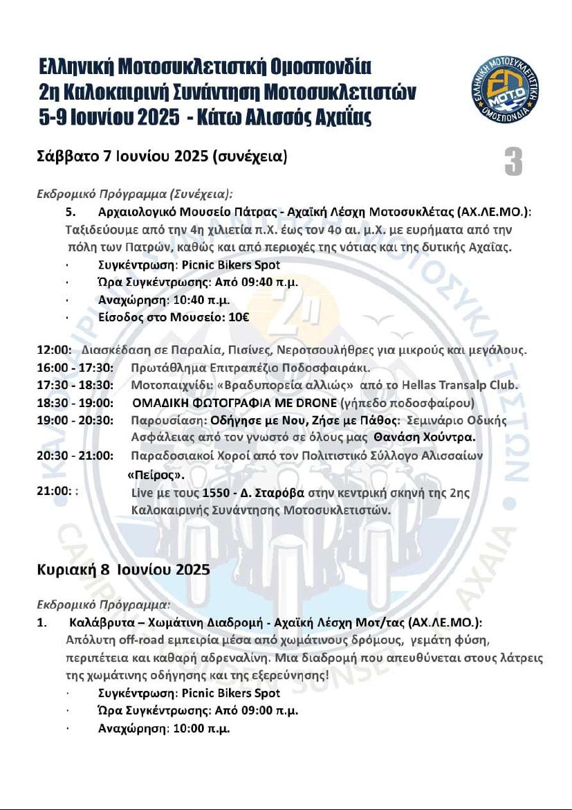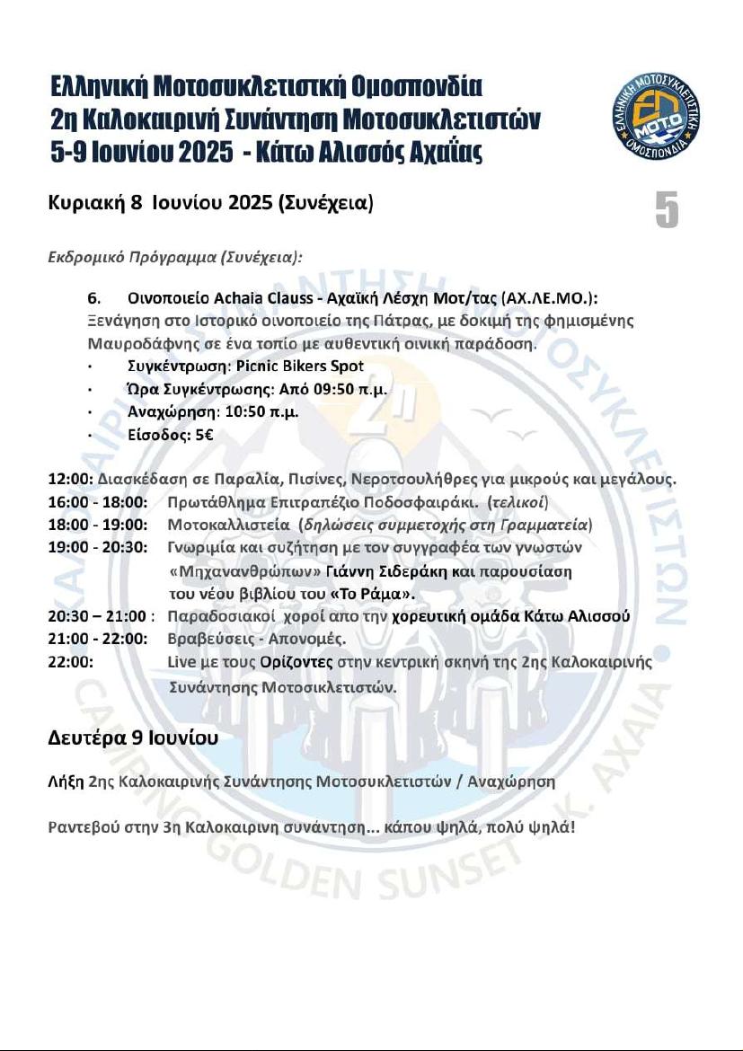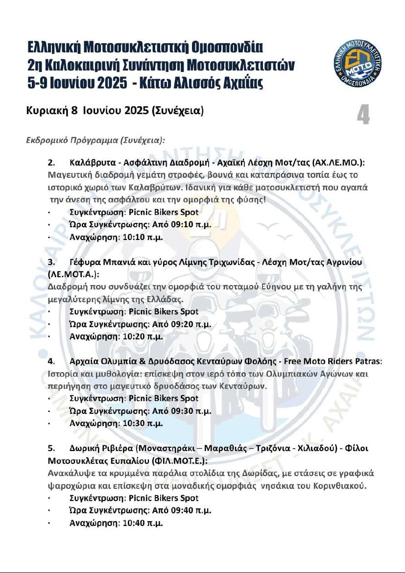 Για πέντε ημέρες μοτοσικλετιστές απ όλη τη χώρα θα βρεθούν στη Δυτική Ελλάδας απολαμβάνοντας μοναδικά τοπία, γνωριμία με την ιστορία και τον πολιτισμό της Αχαϊας, της αιτωλοακαρνανίας και της Ηλείας μέσα από εκδρομές, μοτοπαιχνίδια, συναυλίες, και εκπλήξεις για μικρούς και μεγάλους.