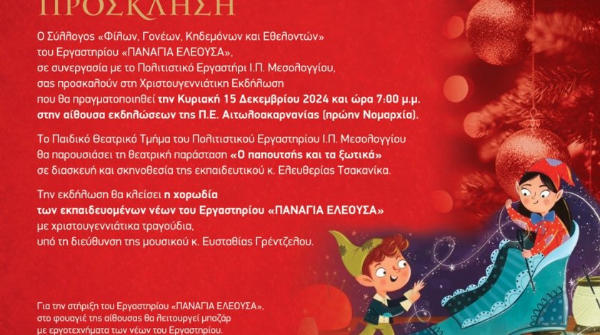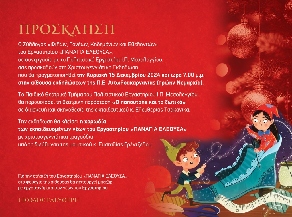 Μεσολόγγι – Θεατρική Παράσταση: «Ο Παπουτσής και τα ξωτικά», από το «Παναγία Ελεούσα» 11 Δεκεμβρίου 2024 AgrinioDaily Μεσολόγγι – Θεατρική Παράσταση: «Ο Παπουτσής και τα ξωτικά», από το «Παναγία Ελεούσα»
