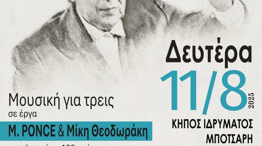 Στο πλαίσιο των εκδηλώσεων του Δήμου Ναυπακτίας για το Καλοκαίρι του 2025, και με αφορμή τη συμπλήρωση των 100 χρόνων από τη γέννηση του Μίκη Θεοδωράκη, παρουσιάζεται στον Κήπο του Αρχοντικού Μπότσαρη (Ιδρύματος Δημητρίου και Αίγλης Μπότσαρη), την Δευτέρα, 11 Αυγούστου 2025 και ώρα 21:00’, η μουσική εκδήλωση «Μουσική για Τρεις» με έργα M.PONCE και Μίκη Θεοδωράκη.