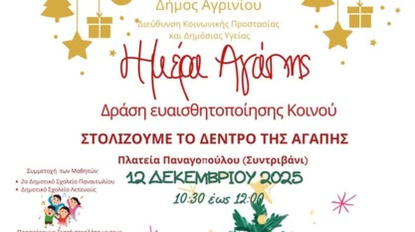 Με αφορμή την Παγκόσμια Ημέρα Αγάπης, η Διεύθυνση Κοινωνικής Προστασίας και Δημόσιας Υγείας και οι Κοινωνικές Δομές του Δήμου Αγρινίου, στολίζουν το Δέντρο της Αγάπης στην πλατεία Παναγόπουλου (Σιντριβάνι), την Παρασκευή 12 Δεκεμβρίου 2025, από τις 10.30 -12:00.