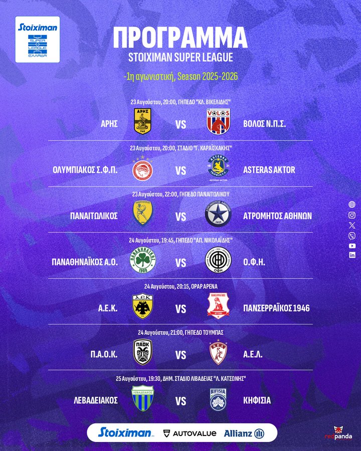 Ο Παναθηναϊκός παίζει με τον ΟΦΗ εντός έδρας την Κυριακή 24/08 στις 19:45. Η ΑΕΚ ξεκινάει κι εκείνη με εντός, αφού αντιμετωπίζει στην «OPAP Arena» τον Πανσερραϊκό (24/08-20:15). Τέλος ΠΑΟΚ και Άρης κοντράρονται με ΑΕΛ (24/08-21:00) και Βόλο (23/08-20:00) αντίστοιχα εντός έδρας.