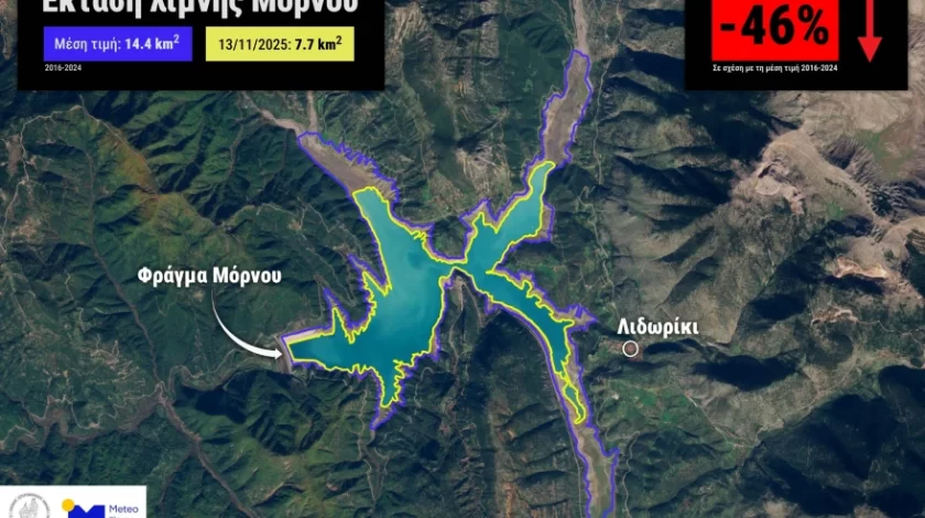 Την κρισιμότητα της κατάστασης επιβεβαιώνουν και τα επιστημονικά δεδομένα του Εθνικού Αστεροσκοπείου Αθηνών. Δορυφορική ανάλυση που πραγματοποίησε η υπηρεσία Meteo.gr στις 9 Οκτωβρίου 2025 έδειξε ότι η έκταση της λίμνης του Μόρνου έχει συρρικνωθεί στα 8.3 τετραγωνικά χιλιόμετρα, τιμή μειωμένη κατά 44% σε σχέση με τη μέση τιμή της περιόδου 2016-2024 (14.9 km²).