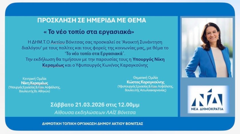 Η Δημοτική Τοπική Οργάνωση Ακτίου Βόνιτσας σας προσκαλεί σε μια ανοιχτή εκδήλωση διαλόγου με πολίτες και εκπροσώπους της τοπικής κοινωνίας, με κεντρικό θέμα: