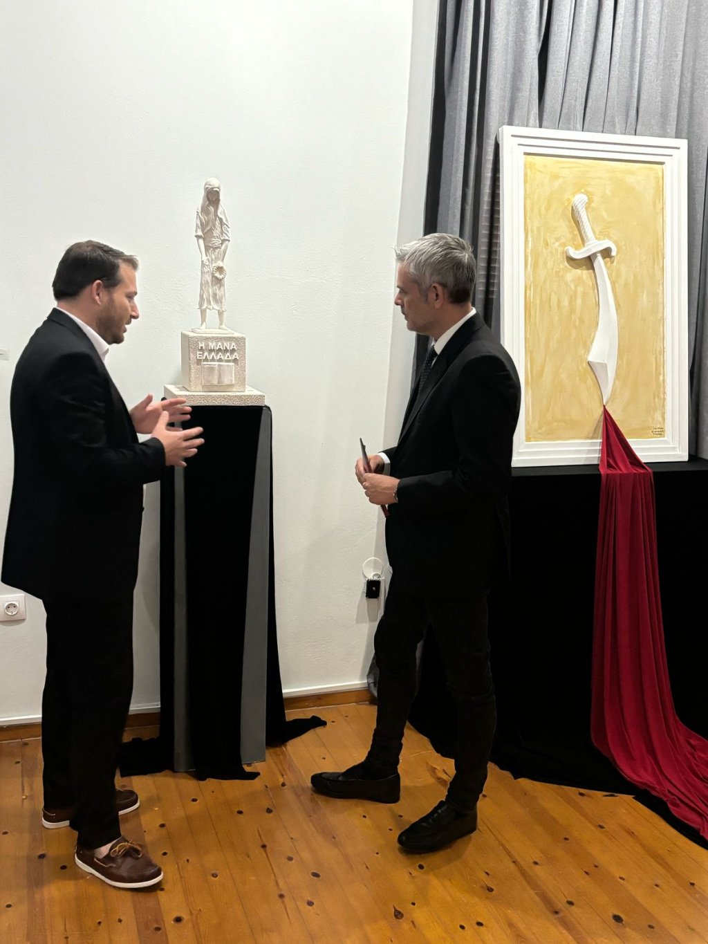 Ο κ. Καραγκούνης ξεναγήθηκε από τον γλύπτη στους χώρους της έκθεσης θαυμάζοντας τις εικαστικές δημιουργίες τις οποίες ο καλλιτέχνης έχει εμπνευστεί από τις ηρωικές μορφές των Αγωνιστών και κυρίως αυτές των Ελεύθερων Πολιορκημένων.