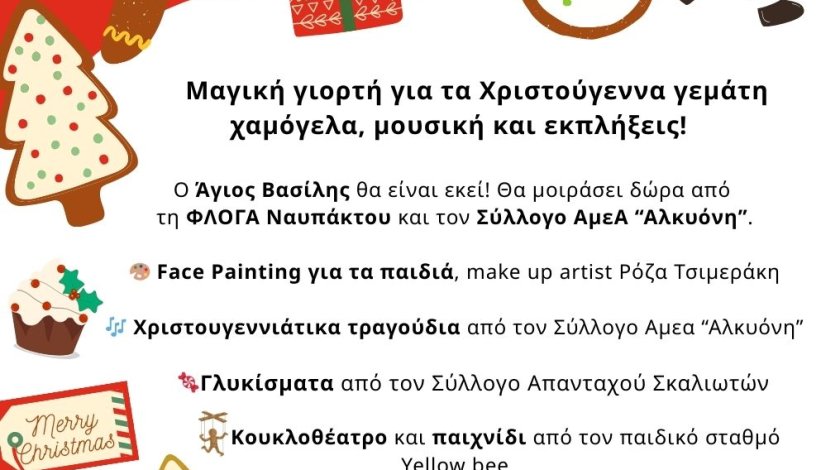 Ο Άγιος Βασίλης θα είναι εκεί και θα μοιράσει δώρα στα παιδιά από τη ΦΛΟΓΑ Ναυπάκτου και τον Σύλλογο ΑμεΑ «Αλκυόνη». Για τους μικρούς φίλους θα υπάρχει face painting, κουκλοθέατρο και παιχνίδι από τον παιδικό σταθμό Yellow Bee.