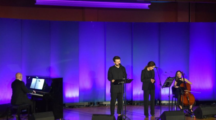 Ο συνθέτης Δημήτρης Μαραμής στο πιάνο, ο τραγουδιστής Θοδωρής Βουτσικάκης, η αφηγήτρια Μαρίνα