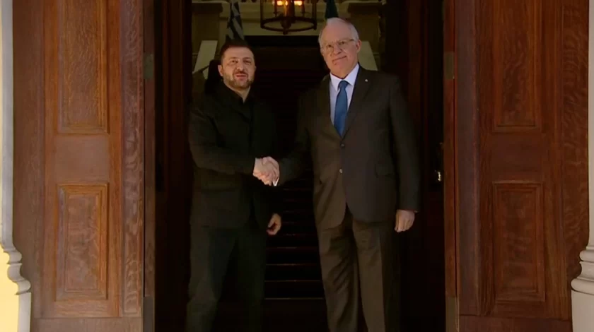 Στην πόρτα του Προεδρικού Μεγάρου υποδέχθηκε τον Ουκρανό πρόεδρο ο Πρόεδρος της Δημοκρατίας Κωνσταντίνος Τασούλας.