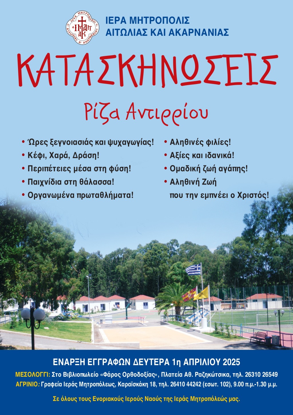 Συνεχίζονται οι εγγραφές στις Κατασκηνώσεις της Ιεράς Μητροπόλεως Αιτωλίας και Ακαρνανίας στις παραθαλάσσιες εγκαταστάσεις της περιοχής Ρίζας Αντιρρίου.
