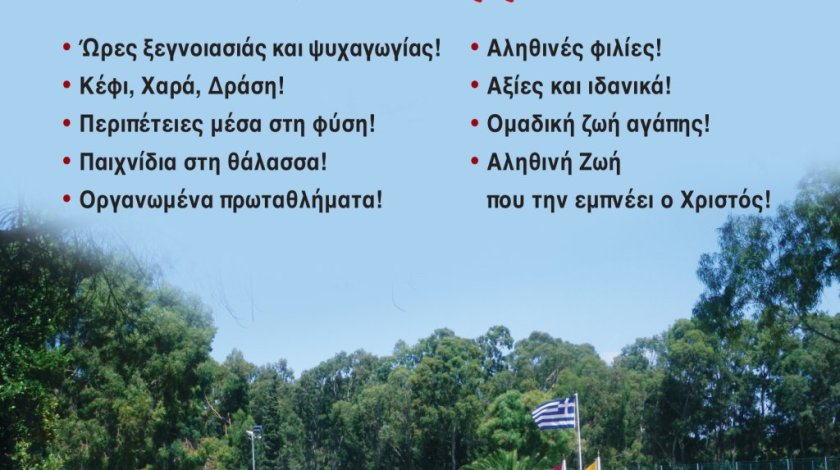 Συνεχίζονται οι εγγραφές στις Κατασκηνώσεις της Ιεράς Μητροπόλεως Αιτωλίας και Ακαρνανίας στη Ρίζα Αντιρρίου για αγόρια και κορίτσια Στ’ Δημοτικού, Γυμνασίου, Λυκείου, Φοιτητές και Φοιτήτριες.
