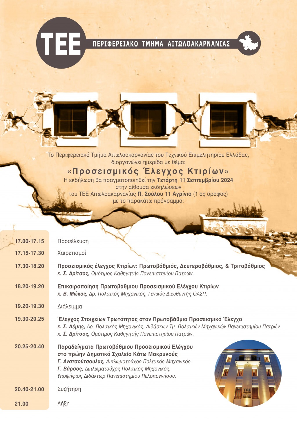 ΤΕΕ: Εκδήλωση στο Αγρίνιο για τον Προσεισμικό έλεγχο των κτιρίων 11 Σεπτεμβρίου 202411 Σεπτεμβρίου 2024 AgrinioDaily ΤΕΕ: Εκδήλωση στο Αγρίνιο για τον Προσεισμικό έλεγχο των κτιρίων