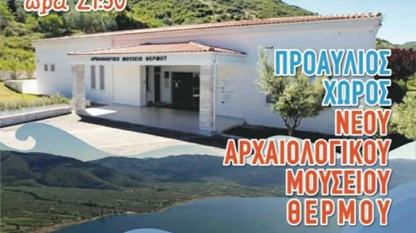 Η Εταιρεία Φίλων Μουσείου και Αρχαιολογικού Χώρου Θέρμου, σε συνδιοργάνωση με την Εφορεία Αρχαιοτήτων Αιτωλοακαρνανίας και Λευκάδος και τον Δήμο Θέρμου, σας προσκαλεί την Τρίτη 19 Αυγούστου στις 21:30 στη μουσική εκδήλωση έντεχνου ρεπερτορίου με τίτλο: “Υδάτινες Διαδρομές” με τους Μικαέλλα Παπαχρυσάνθου, Ανδρέα Φούκα και Πόπη Αργυροπούλου, στον προαύλιο χώρο του Αρχαιολογικου μουσείου Θέρμου.