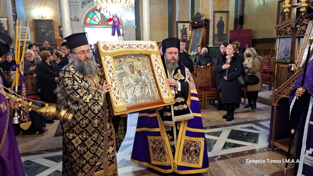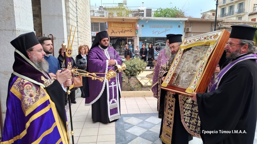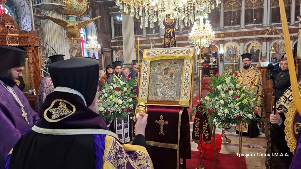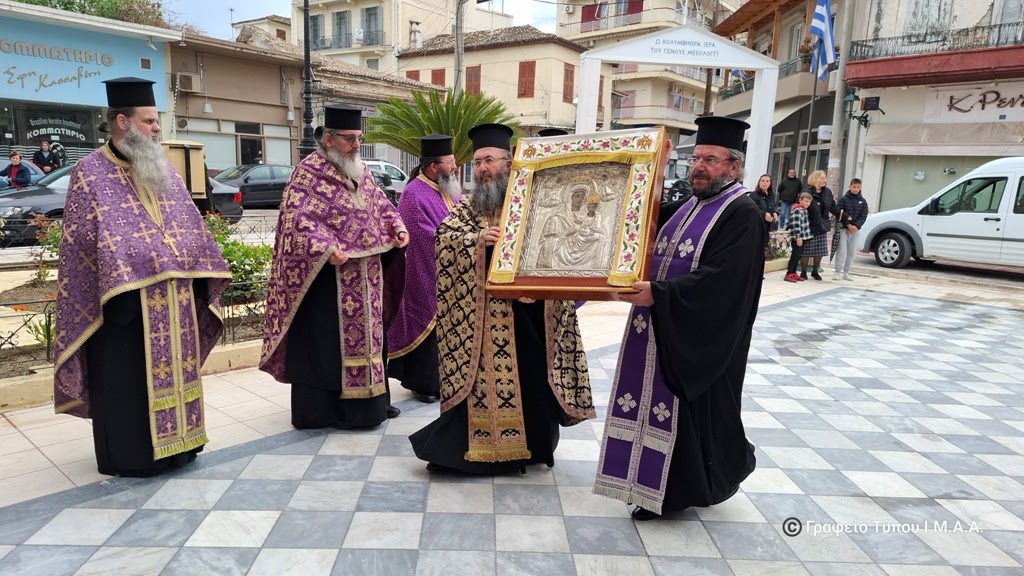 Την Ιερά και Θαυματουργό Εικόνα της Υπεραγίας Θεοτόκου της Αρεθιώτισσας, από την Ιερά Μονή Γενεσίου της Θεοτόκου Ρέθα Βάλτου υποδέχθηκε η Ιερά Πόλη του Μεσολογγίου, στον Ιερό Ναό της Αγίας Παρασκευής, το απόγευμα της Δευτέρας 31ης Μαρτίου 2025.